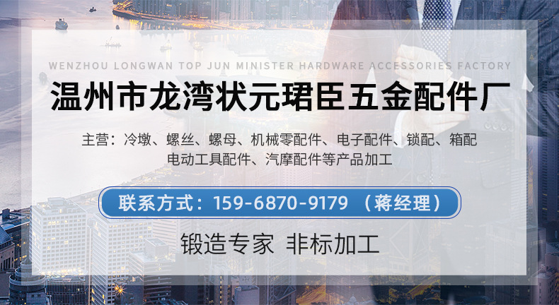 温州市龙湾状元珺臣五金配件厂以紧固件、螺丝、五金配件等产品专业生产加工的公司,拥有台湾进口冷镦成型机8B—19B多台,螺丝成型机一模二冲二模三冲,两模四多台,自动仪表车床,攻牙机,搓丝机等,本厂主要以冷墩煅造为主以自动仪表和搓牙为辅完整结合。温州市龙湾珺臣五金配件厂的诚信、实力和产品质量获得业界的认可。欢迎各界朋友莅临参观、指导和业务洽谈。