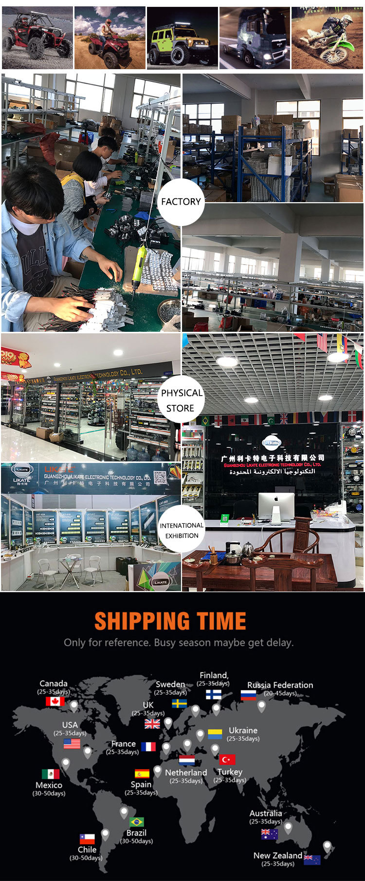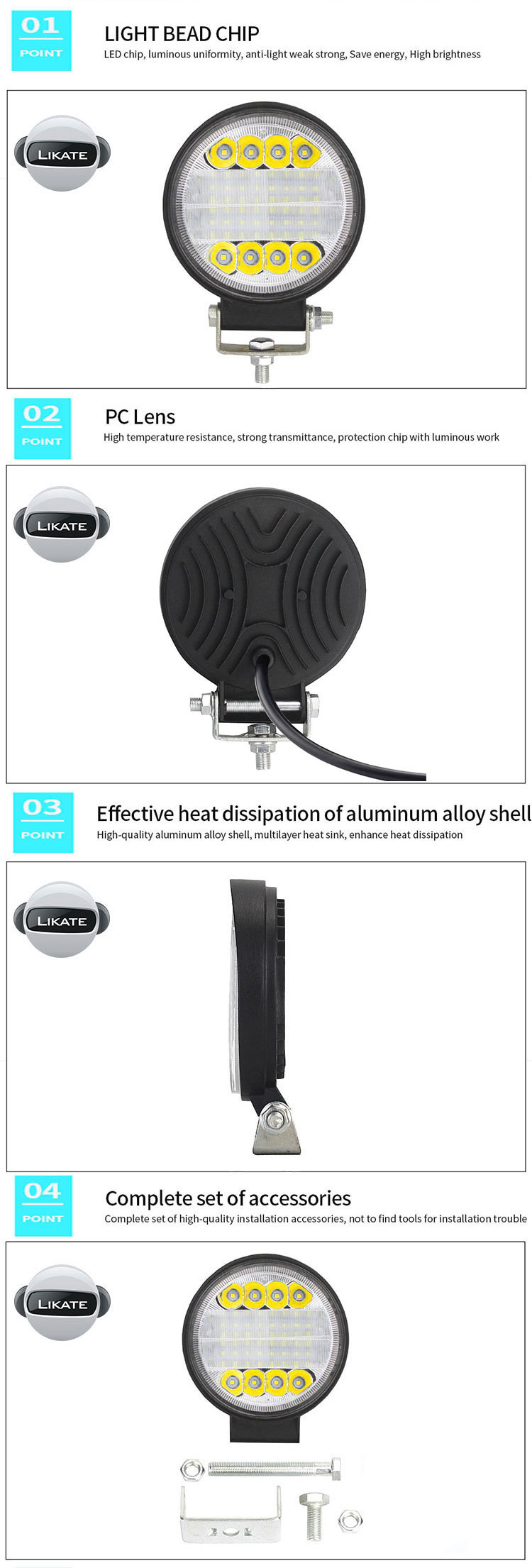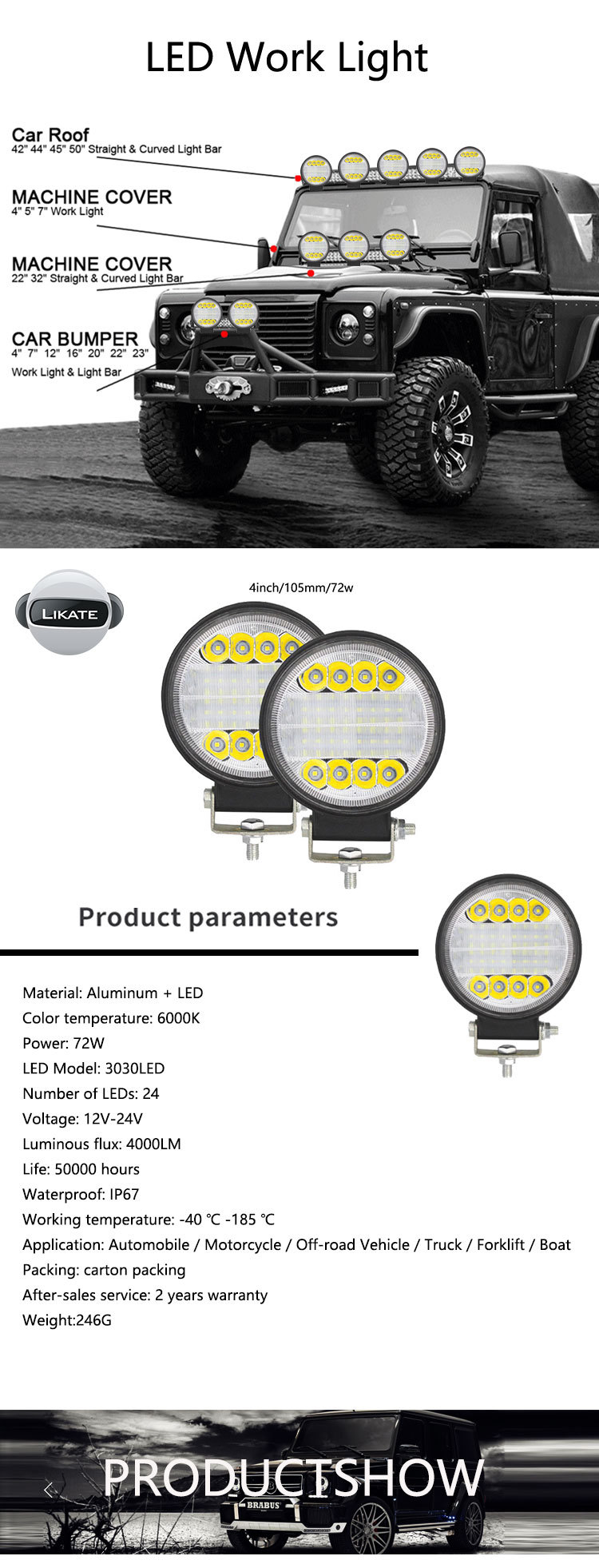 产品应用: 越野车,沙滩车,货车,船,大巴,挖掘机,伐木机,压路机,推土机,吊车,采矿车,消防车,警车,抢险车,通信车,军佣指挥车,叉车,火车,坦克等车辆加强照明使用.