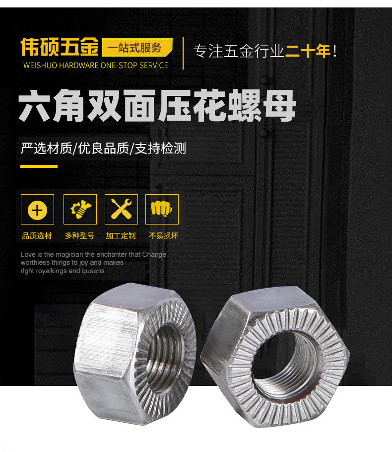 本网页所展示的有关【供应六角双面压花螺母带齿防滑螺帽六角螺母压花压铆件压板螺母_六角螺母_苏州伟硕五金制品有限公司】的信息/图片/参数等由全球零部件网的会员【苏州伟硕五金制品有限公司】提供,由全球零部件网会员【苏州伟硕五金制品有限公司】自行对信息/图片/参数等的真实性、准确性和合法性负责,本平台(本网站)仅提供展示服务,请谨慎交易,因交易而产生的法律关系及法律纠纷由您自行协商解决,本平台(本网站)对此不承担任何责任。您在本网页可以浏览【供应六角双面压花螺母带齿防滑螺帽六角螺母压花压铆件压板螺母_六角螺母_苏州伟硕五金制品有限公司】有关的信息/图片/价格等及提供【供应六角双面压花螺母带齿防滑螺帽六角螺母压花压铆件压板螺母_六角螺母_苏州伟硕五金制品有限公司】的商家公司简介、开元kaiyuan(中国)等信息。