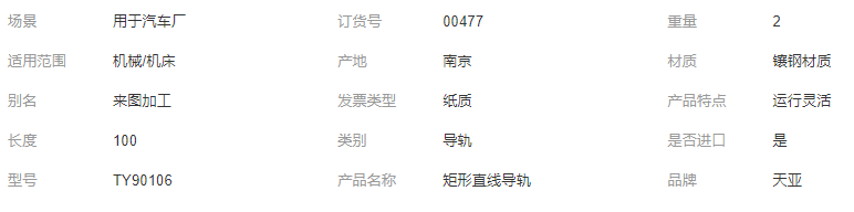 本网页所展示的有关【TY90106 矩形直线导轨 天亚 用于汽车厂 运行灵活 来图加工 镶钢材质_导轨_南京天亚机械刀片有限公司】的信息/图片/参数等由全球零部件网的会员【南京天亚机械刀片有限公司】提供,由全球零部件网会员【南京天亚机械刀片有限公司】自行对信息/图片/参数等的真实性、准确性和合法性负责,本平台(本网站)仅提供展示服务,请谨慎交易,因交易而产生的法律关系及法律纠纷由您自行协商解决,本平台(本网站)对此不承担任何责任。您在本网页可以浏览【TY90106 矩形直线导轨 天亚 用于汽车厂 运行灵活 来图加工 镶钢材质_导轨_南京天亚机械刀片有限公司】有关的信息/图片/价格等及提供【TY90106 矩形直线导轨 天亚 用于汽车厂 运行灵活 来图加工 镶钢材质_导轨_南京天亚机械刀片有限公司】的商家公司简介、开元kaiyuan(中国)等信息。
