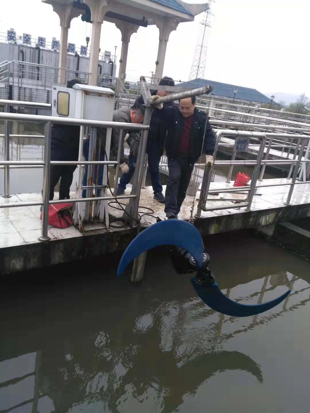 潜水推流器成套装置,包括安装系统和提升装置。安装系统由方钢导杆和顶部部和底部支座等组成,可自由调整推流器的提升和下降,并可在不排空水池的情况下拆卸和安装推流器。推流器装在一个可在导杆上滑动的支架上作为一个整体,该支架能够承受推流器的整个重量和造成的所有推力。提升装置应为可移动式,起吊架的固定装置不可安装在池壁上或池测工作平台上,安装在安装系统的顶部支座上,含专用起吊钩、提升链和葫芦。每台推流器配备一套起吊架。