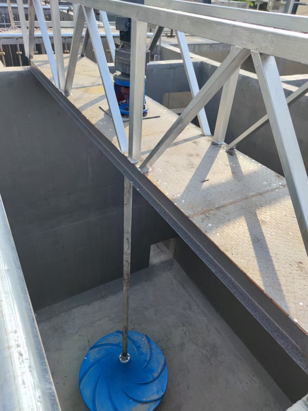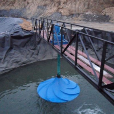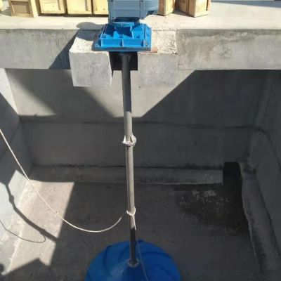 杜安环保立式涡轮搅拌器由电机、减速机、玻璃钢叶轮、机架、传动轴和就地控制箱等组成。