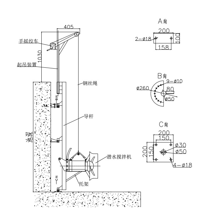 导轨系统由方钢导杆、起吊装置和调向盘等组成,电机自带支撑架。可自由调整搅拌机的提升和下降,排空水池情况下拆卸和安装潜水搅拌机。潜水搅拌机全部的重量受力在它的支架上,此支架承受潜水搅拌机形成的推力。